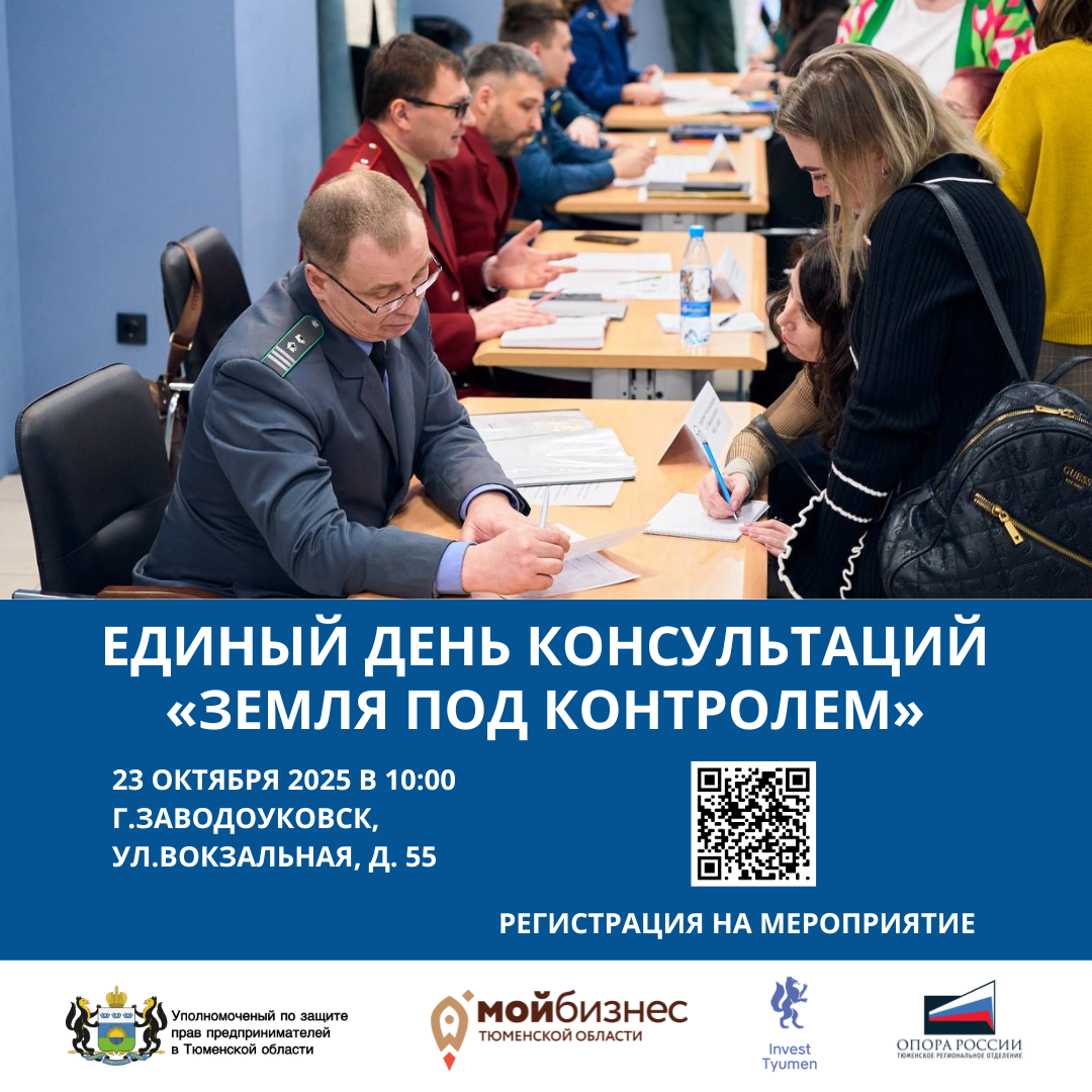 В Тюменской области пройдёт единый день консультаций "Земля под контролем". Начало в 10:00, 23 октября 2025 в заводоуковском культурно-досуговом центре, г. Заводоуковск, ул. Вокзальная, д. 55.