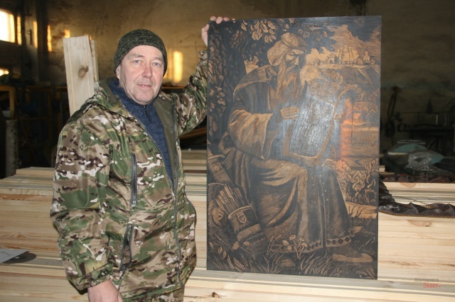 Ветеран-афганец и активный общественник Александр Первухин показывает одну из своих ранних копий-гравюр по дереву середины 80-х по мотивам одного из российских художников.