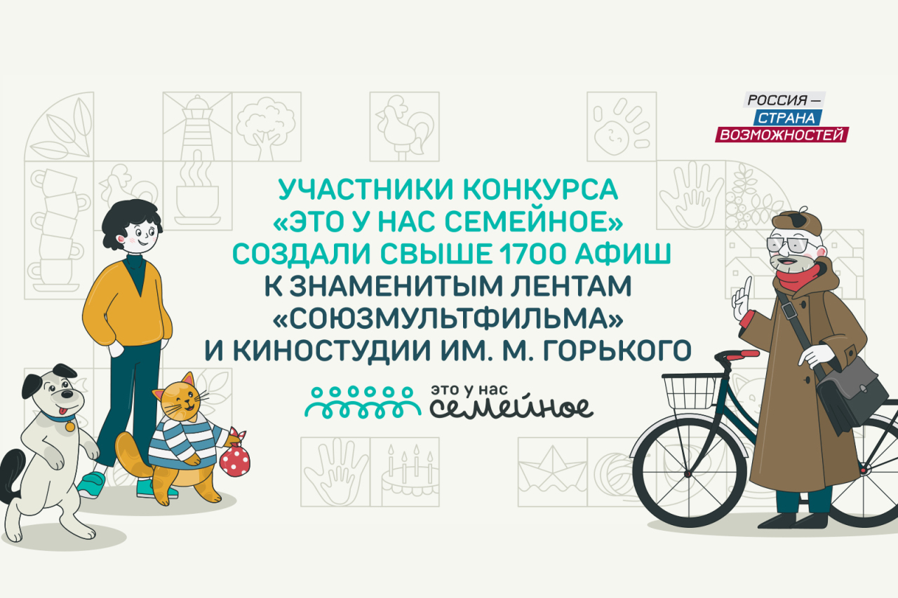 1735 афиш к известным отечественным мультфильмам и фильмам создали участники второго сезона конкурса "Это у нас семейное" – самого народного проекта Президентской платформы "Россия – страна возможностей". В рамках дистанционного задания "Мультафиша" от киностудий "Союзмультфильм" и им. М. Горького отобрали восемь фоторабот, авторы которых проявили наибольшую креативность. Они создали афиши к "Чебурашке", "Карлсону", "Морозко" и другим лентам, вовлекая в процесс всех родных и даже домашних питомцев. Семьи-победители получили призы от партнеров проекта.
