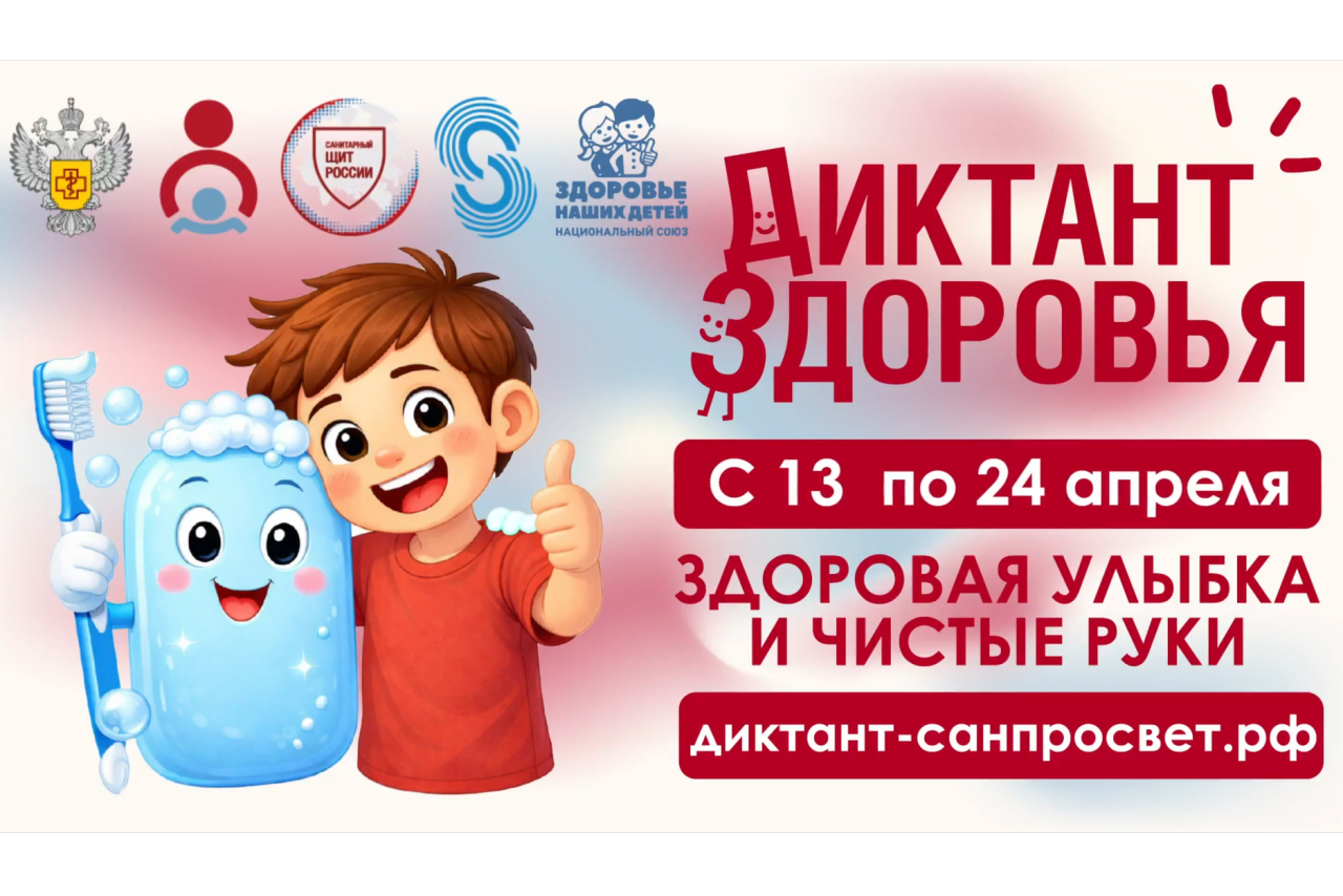 С 13 по 24 апреля 2026 года Роспотребнадзор запускает первый тематический трек Всероссийской санитарно-просветительской акции "Диктант здоровья" — "Здоровая улыбка и чистые руки". Модератором проекта выступает ФБУН "Новосибирский НИИ гигиены" Роспотребнадзора.